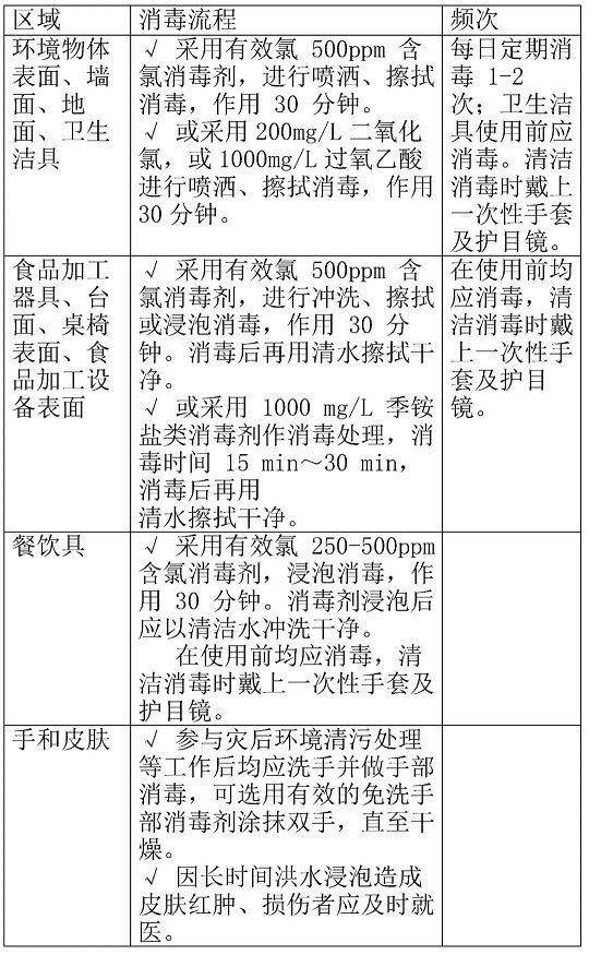 √ 在佩戴好个人防护装备后,委托专业人员对门店的所有电路系统、换气系统、水供应系统、煤气管道、排水系统等基础保障进行安全性、干燥性确认。对损坏部分及时进行维修, 如电力供应出现问题可在确认使用条件允许后,临时采用发电机代替供电,如水供应系统出现污染等问题,可采用桶装水或瓶装水完成后续清洁消毒工作。