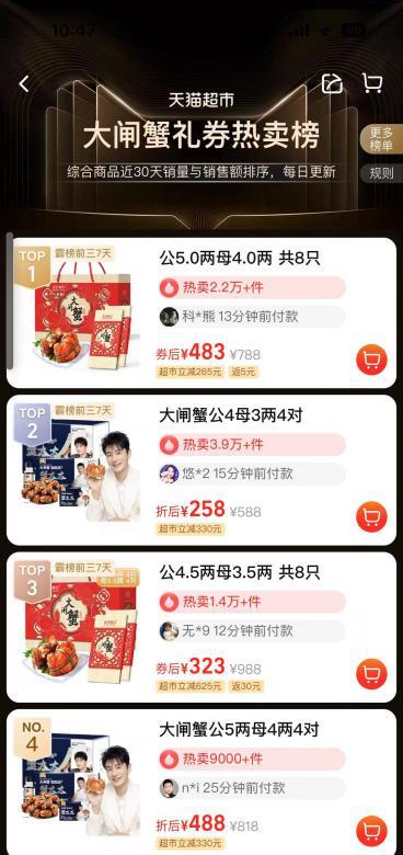 一直以来,星农联合与天猫超市有着良好的合作基础,据悉,星农联合大闸蟹为天猫超市天机大闸蟹提货券类目销量第一,在天猫超市大闸蟹礼券热卖榜中,已连续霸榜前三7天。