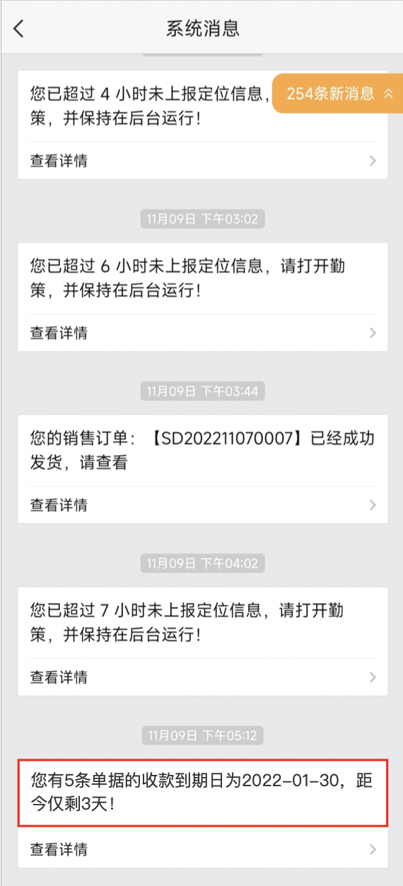 根据客户结算方式,临近单据的收款期限,系统会自动给业务员推送收款消息提醒。