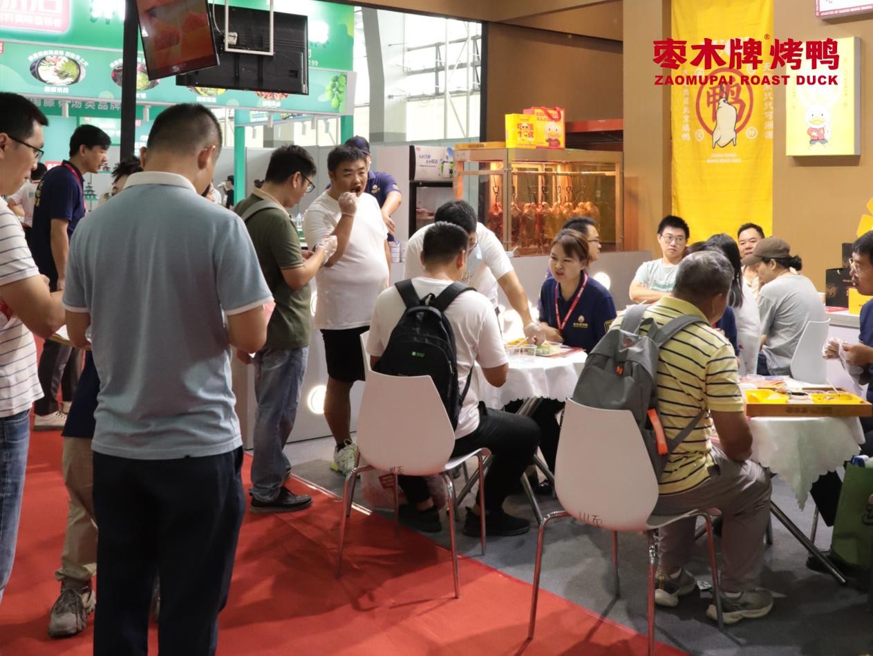 今年,枣木牌烤鸭在GFE现场让众多参展观众挪不动脚步,在展会面前排起了长队,这是因为枣木牌烤鸭把门店复制到了展会现场,直接在展会“现烤现片”,肉香四溢的鸭肉让观众垂涎欲滴。这种“现烤现片”看得见的出餐模式给顾客带来的体验感是极强的,现场的试吃长龙让投资客们接踵而至,展会三天时间接待深度洽谈客户超300批。