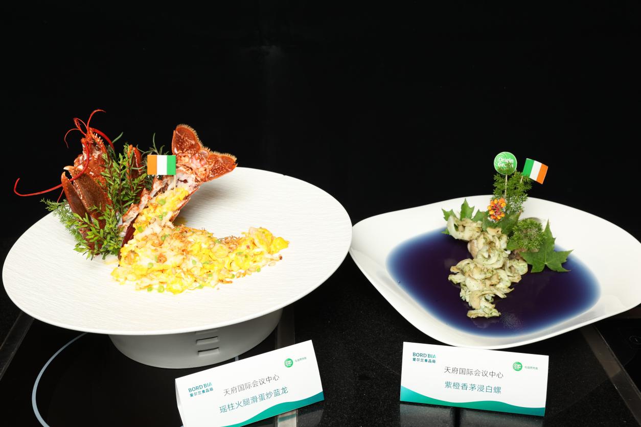 金汁玉环水晶爱尔兰蓝龙虾以爱尔兰活蓝龙为主料,酸辣味为底味,保留了川菜的麻辣鲜香的同时,配以黄灯笼辣椒特调的金汤汁及花菜冬瓜雕刻的宝塔,菜品色泽鲜明,充满了蜀绣的古色古香、诗情画意,正是钟灵毓秀、人杰地灵的川蜀大地的缩影,是爱尔兰海鲜融入川菜的完美象征。