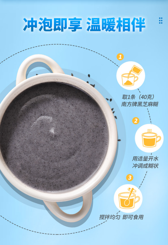 南方牌黑芝麻糊的另一个独特之处在于其卓越的冲调性,普通的黑芝麻糊可能需要一些时间和精力来冲泡,但南方牌黑芝麻糊的技术升级使它更容易冲调。这对于中老年人来说特别有用,因为他们可能更加注重食物的便捷性和易制备性。