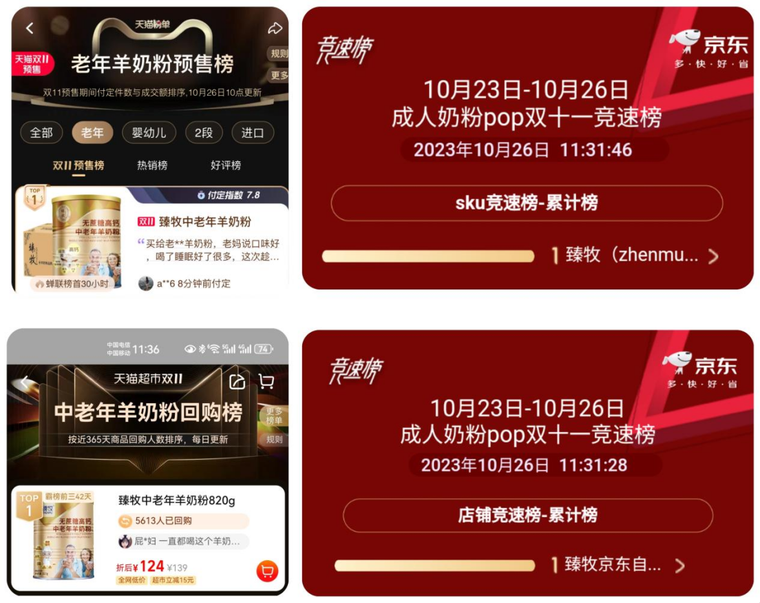 双11全球购物节预售开启,臻牧羊奶粉作为乳业中老年类目领先品牌,积极拥抱消费新趋势,拿下主流赛道开门红双料冠军!根据天猫京东预售期官方榜单数据显示:臻牧登顶天猫超市中老年羊奶粉回购榜、天猫老年羊奶粉预售榜TOP1!登顶京东成人奶粉POP双11店铺&SKU竞速榜TOP1!