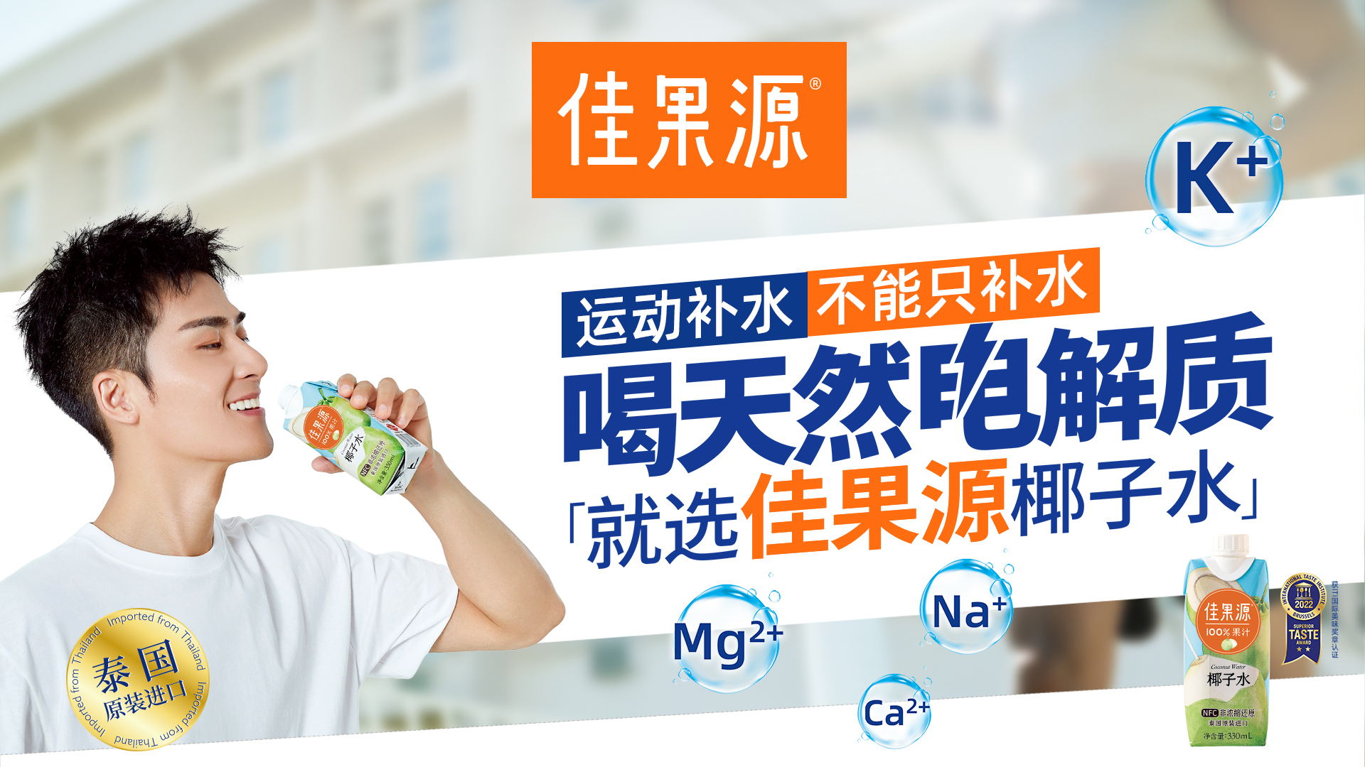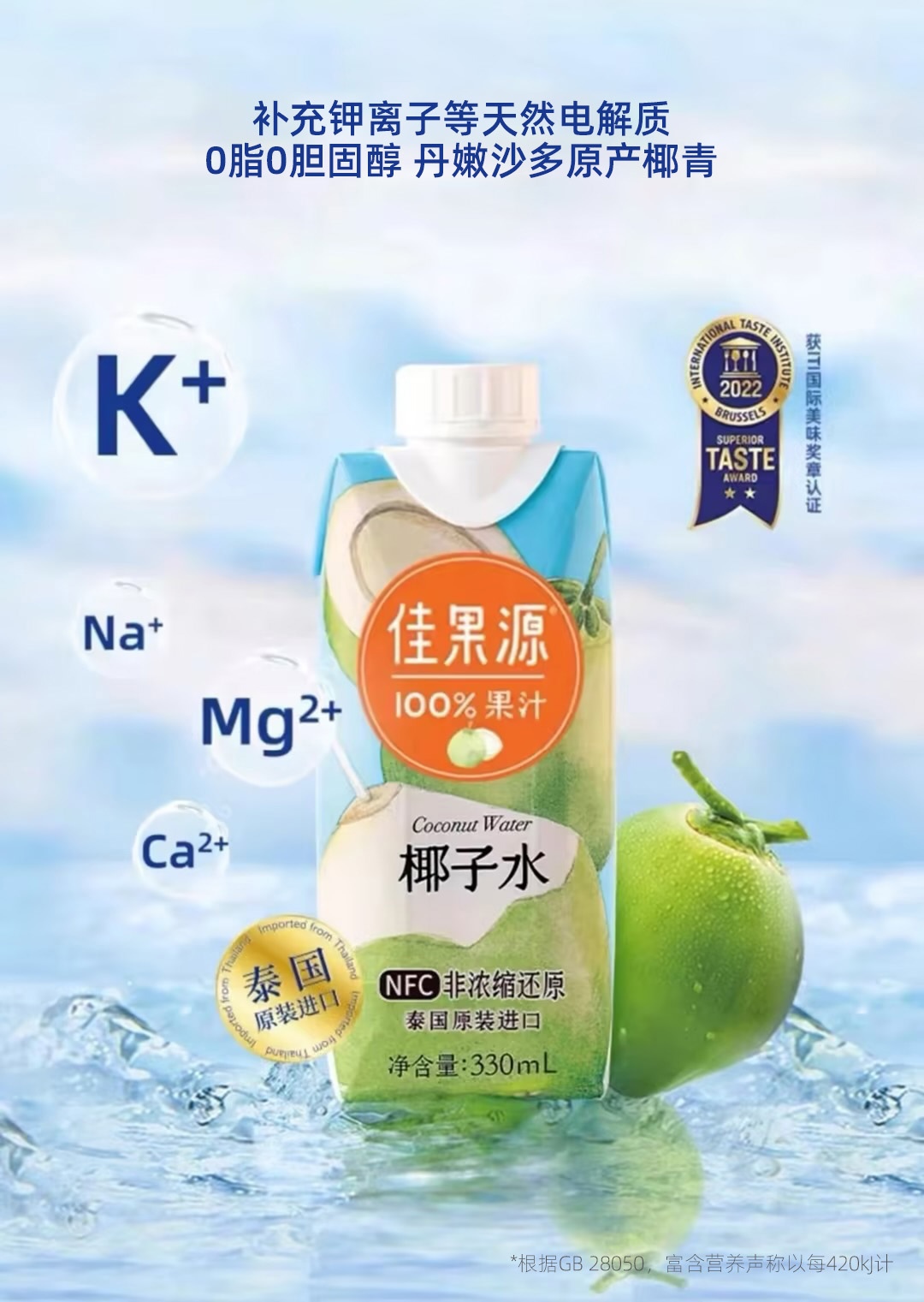 佳果源椰子水口感清甜,椰香浓郁,补充钾离子等天然电解质,特别适合运动等场景后的补水饮用。