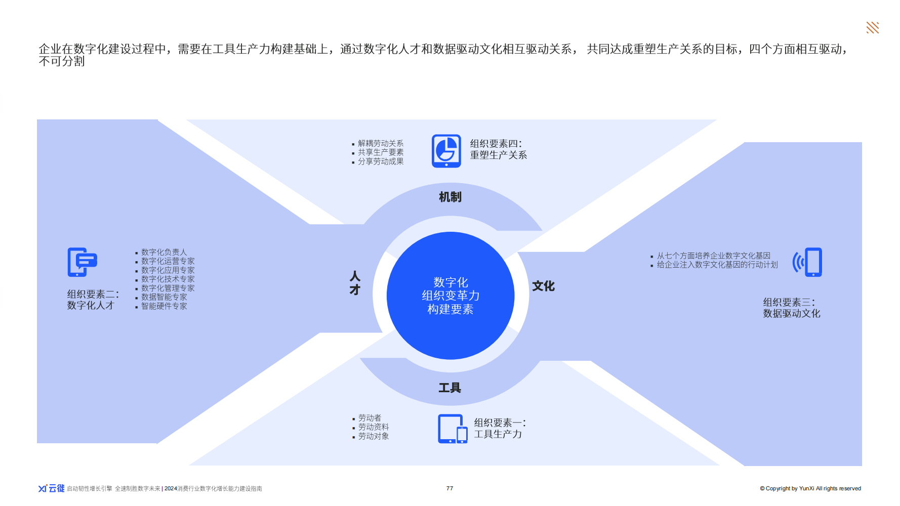 《指南》指出10个运营力构建的目的,一是赋能内部运营组织,二是赋能外部增长源头,这就需要改良甚至重建能够孵化出卓越数字化组织能力的土壤,从工具、人才、文化、生产关系四个数字化组织要素逐步推进,快速发展提升数字化组织能力,更好赋能企业内外部各个增长源,驱动数字化增长。