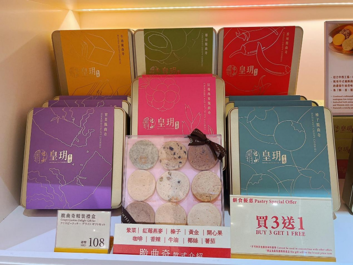 步行3分钟到达佐敦道鸿运大厦「香港皇玥」买手信,皇玥今年继续获得世界食品品质评鉴大奖(Monde Selection) 中的“大金奖”,除了流心奶黄月饼好吃之外,他们的饼食类蝴蝶酥蛋卷曲奇脆条也很出色。他们每个系列多达十款口味,有原味也有适合重口的麻辣蝴蝶酥,满足食客的不同口味需求。原味蝴蝶酥和牛油脆曲奇是皇玥断货王之一,奶香四溢!开心果脆曲奇浓郁的果仁香气;黄金脆曲奇色泽金黄,咸蛋黄味十分浓郁!芝麻蝴蝶酥淡淡甜味、海盐蝴蝶酥咸鲜可口!
