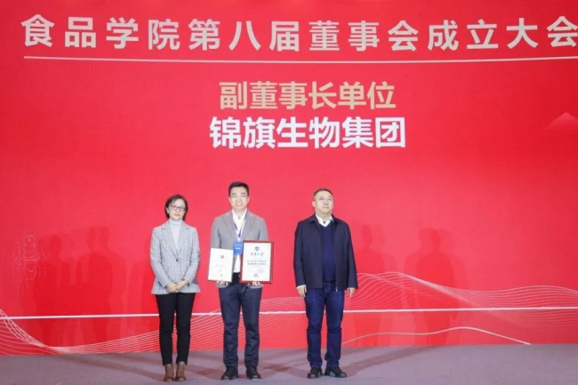 12月1日,江南大学食品学院第八届董事会成立大会在江苏无锡召开。中国工程院院士、江南大学校长陈卫,中国工程院院士、江南大学食品学院教授金征宇,江南大学和国内外的知名专家学者、企业家代表等200家董事会代表共聚一堂,就当前食品产业现状进行主题报告和学术交流。锦旗生物担任江南大学食品学院第八届董事会副董事长单位,在食品及生物技术领域的实力与影响力再度获得行业认可。