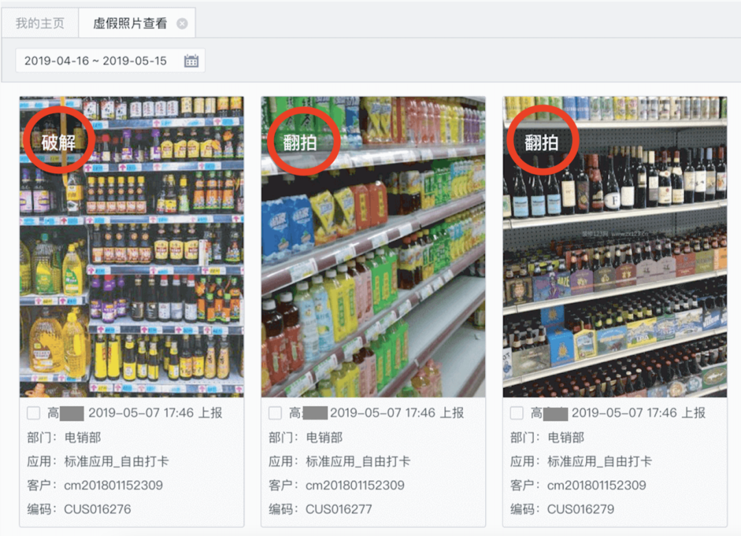 由AI算法精准识别出由业务员通过翻拍照片或相册上传等非店内现场拍照的方式提交的拜访照片,确保照片实拍,避免人为造假;