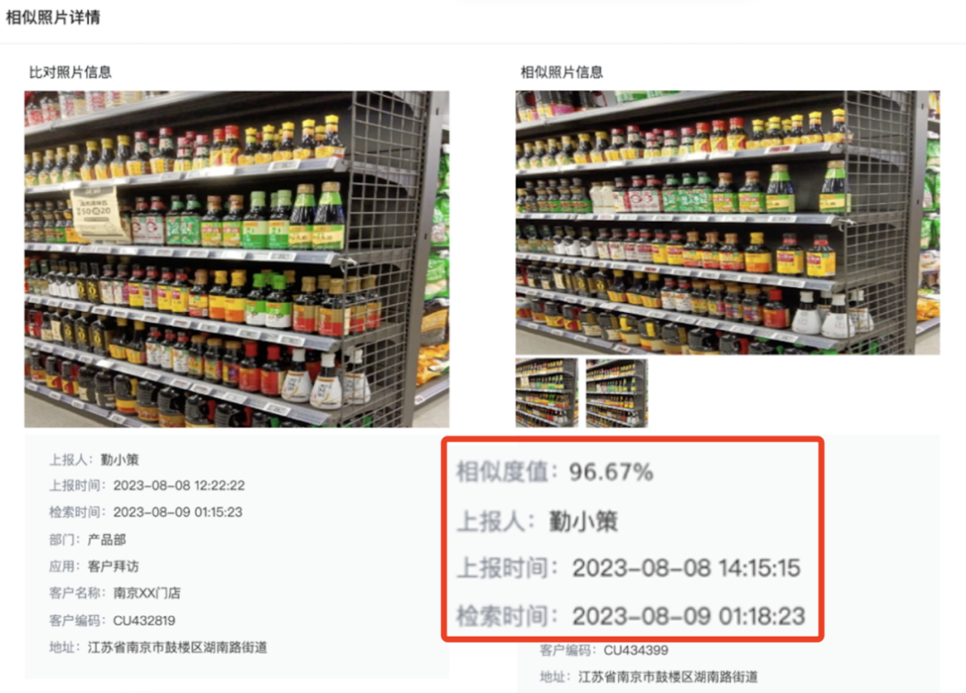 对于像调味品等行业门店在农贸市场内分布过于靠近的情况,卫星跟基站定位的方式实际上已无法准确区分拜访任务具体是在哪家门店内执行,此时由AI算法精确识别出同一门店内的场景重复采集,可以确保上报数据与门店的对应,避免人为捏造。