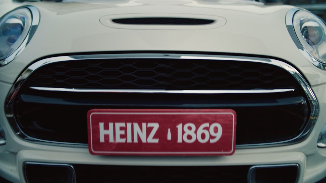 车上的挂坠是亨氏产品小袋装造型。后座上摆放着亨氏创意周边“显眼包”。