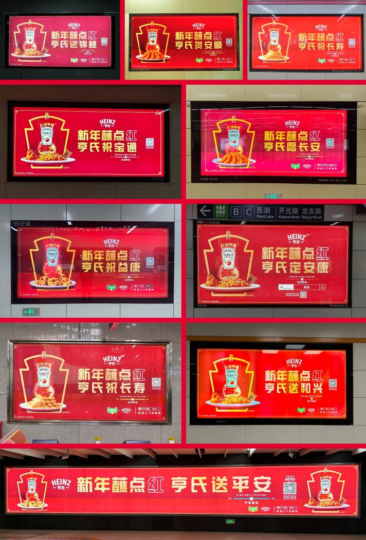 临近春节,十大城市部分地铁站一夜之间被“亨氏红”刷屏,醒目的红色向路过的人们传递着浓浓的新春氛围。