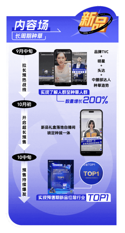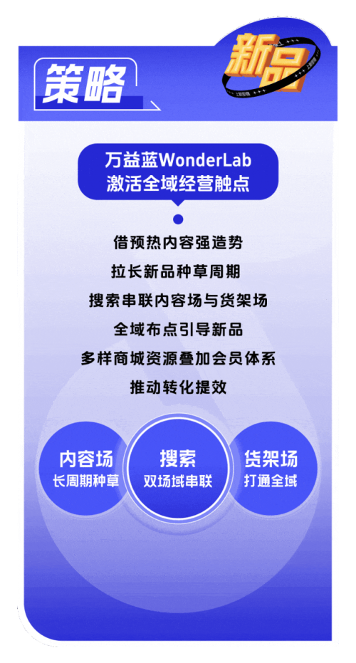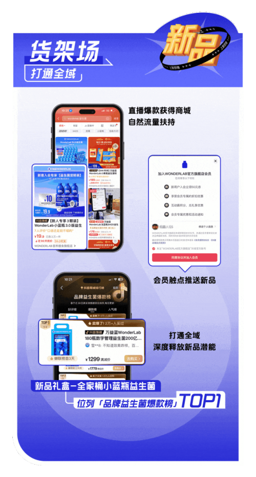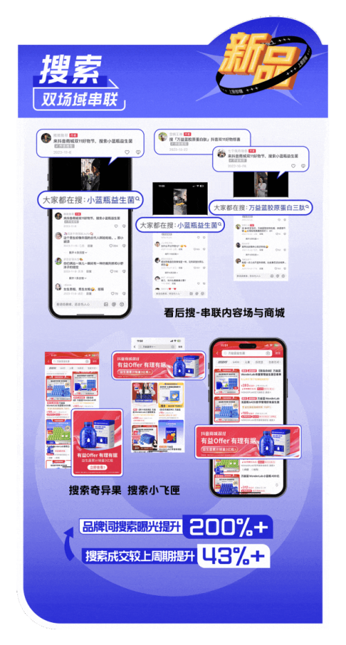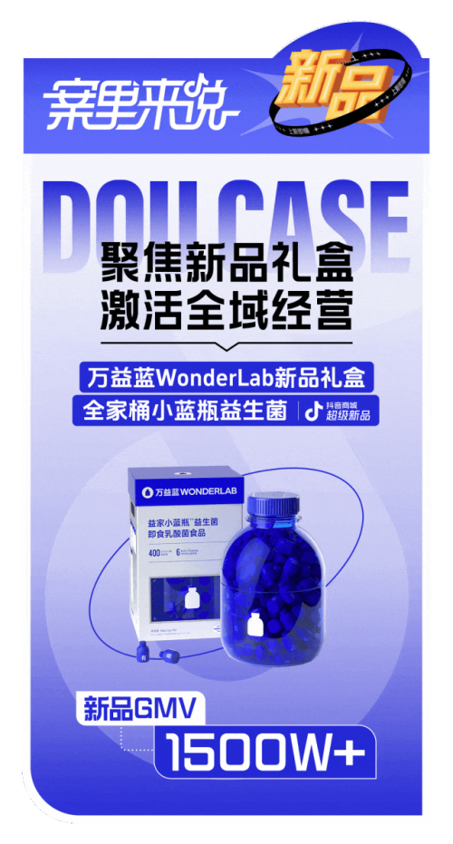 万益蓝 WonderLab 采用「聚焦新品,激活全域」的策略,通过搜索串联内容场与货架场,全域布点引导新品,再借助商城资源和会员体系提高转化效率,并参与到「抖音商城超级新品」活动中,最终实现新品 GMV超 1500 万。