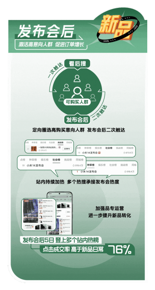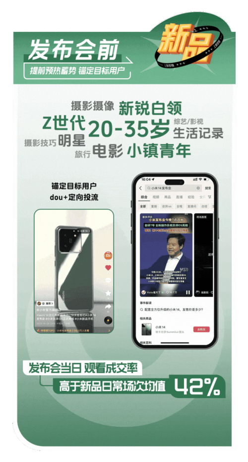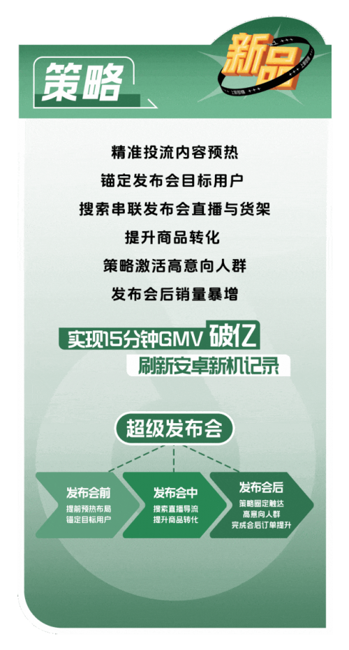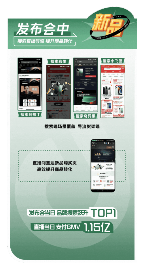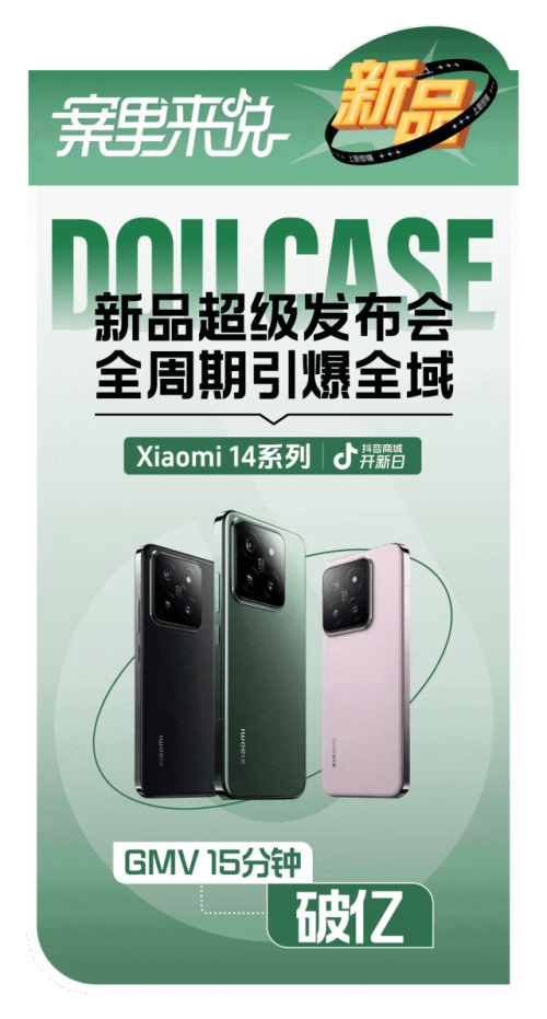 小米通过参与「抖音商城开新日」活动,采用「搜索导流,全域引爆」的策略,聚焦新品发布会全周期,发布会前精准投流、会中直播导流、会后二次触达意向人群,最终 15 分钟 GMV 破亿,刷新了安卓新机记录。