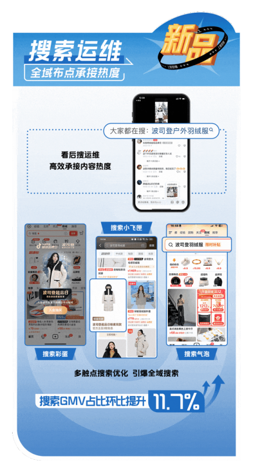 波司登通过「场域联动,全域爆发」的策略,将搜索、内容、商城的高效联通,全域布点承接热度,带动了搜索 GMV 环比提升 3590.6% 。