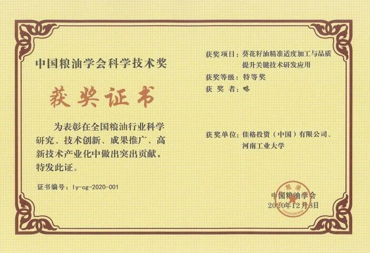 其实,基于对消费者健康的关注,佳格集团研发中心多年来已持续开展包括降低油烟量在内的多项科学研究,近年来成果颇丰:2020年,佳格集团荣获中国粮油学会科学技术奖特等奖,第十五届中国商业联合会科技创新奖二等奖。2017年8月,中国粮油学会科技成果评价佳格“植物油油烟量测定方法的建立及低油烟葵花籽油产品的开发”达到国际先进水平。同时,佳格还建立了“江苏省研究生工作站”“苏州市企业技术中心”“苏州市工程技术研究中心”等多个科技平台,与国内高校及行业协会紧密合作成立联合实验室,如佳格-江南大学联合实验室、中国营养学会--佳格集团营养健康食品研发中心。此外,佳格集团还在低油烟葵花籽油产品的适度精炼工艺技术及植物油油烟量快速检测方法的开发方面展开了深入细致的研究,以期实现低油烟、高品质葵花籽油适度精炼,为消费者提供更安全、更营养、更健康的葵花籽油产品。