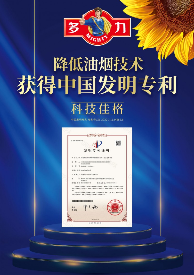 据近日国家知识产权局公告,佳格集团“降低精炼食用植物油油烟量的生产工艺及过渡装置”荣获中国发明专利(专利号:ZL 2022 1 1124686.6)。该项发明专利不仅是佳格公司独立开发技术所获得的核心技术专利,更是行业首个降低油烟量发明专利,填补了国内食用油行业相关技术的空白。