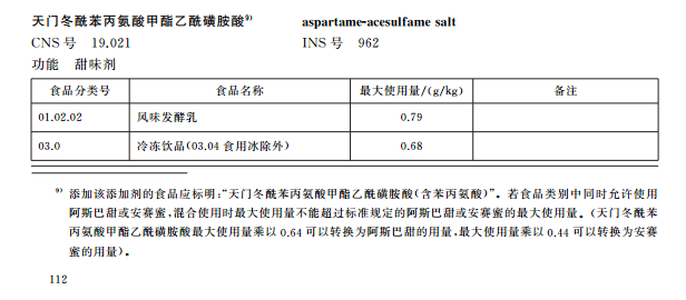 b)若食品类别中同时允许使用天门冬酰苯丙氨酸甲酯乙酰磺胺酸和阿斯巴甜、安赛蜜,混合使用时最大使用量不能超过标准规定的阿斯巴甜、安赛蜜的最大使用量。(天门冬酰苯丙氨酸甲酯乙酰磺胺酸最大使用量乘以0.64可以转换为阿斯巴甜的用量,最大使用量乘以0.44可以转换为安赛蜜的用量)。