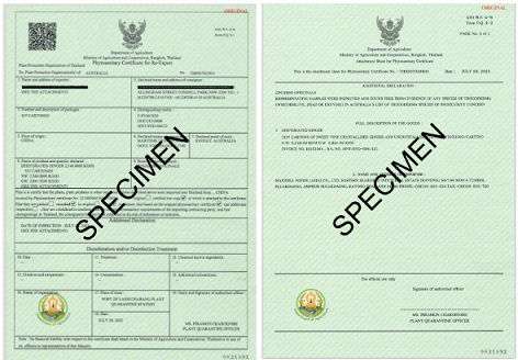 根据《植物检疫法》对进口水果蔬菜进行植物检疫,按照经济重要性及原产地检疫性有害生物流行程度划分为禁止进口、限制进口、无禁止进口三大类,所有出口到泰国的水果蔬菜均需提供出口国的植物检疫证书,在附加声明中注明:“This fruits is in compliance with the Protocol on Inspection and Quarantine Conditions of Fruits to be exported from China to Thailand.”(植物检疫证书格式如下图所示: