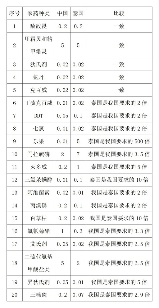我国和泰国白萝卜农药残留限量比对(单位:mg/kg)