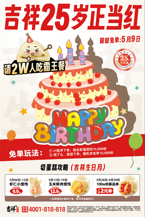 5月9日,吉祥馄饨正式开启25岁周年庆,通过小程序、美团和饿了么平台为社会提供2万份“霸王餐”和满减券等惊喜福利。丰厚的奖励点燃消费者参与热情,2万份免费美食在当天很快被领取一空,吉祥馄饨也凭借出色的口感和匠心品质再度收获如潮好评,不少消费者在采访中表示吉祥馄饨是打工人工作餐的优选。