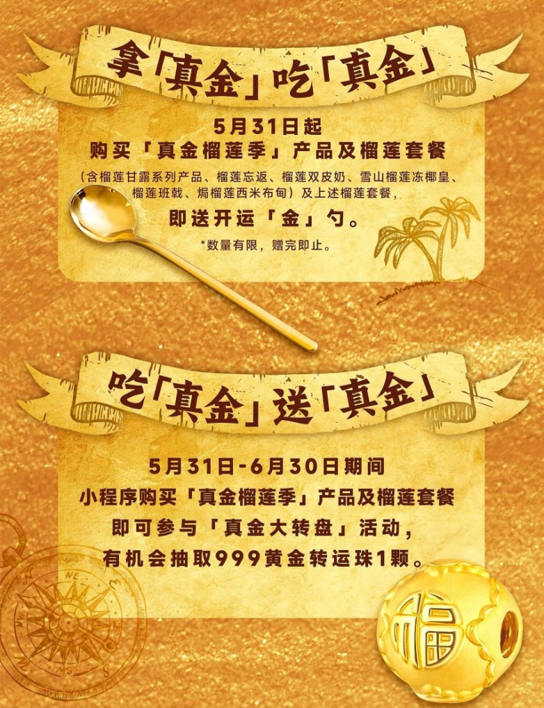 美味缤纷,活动精彩!自5月31日起,购买满记甜品“真金”榴莲季产品及榴莲套餐,即送开运“金”勺(数量有限,赠完即止);5月31日至6月30日期间,在满记甜品小程序购买“真金”榴莲季产品及榴莲套餐,即可参与“真金大转盘”活动,有机会抽取999黄金转运珠1颗。拿真金,吃真金,送真金,叫人很难不心动。