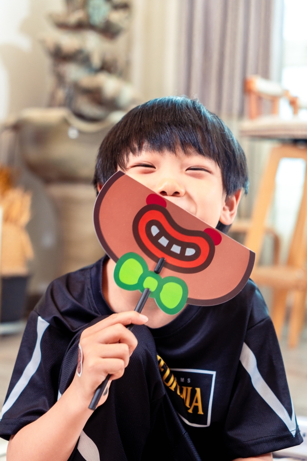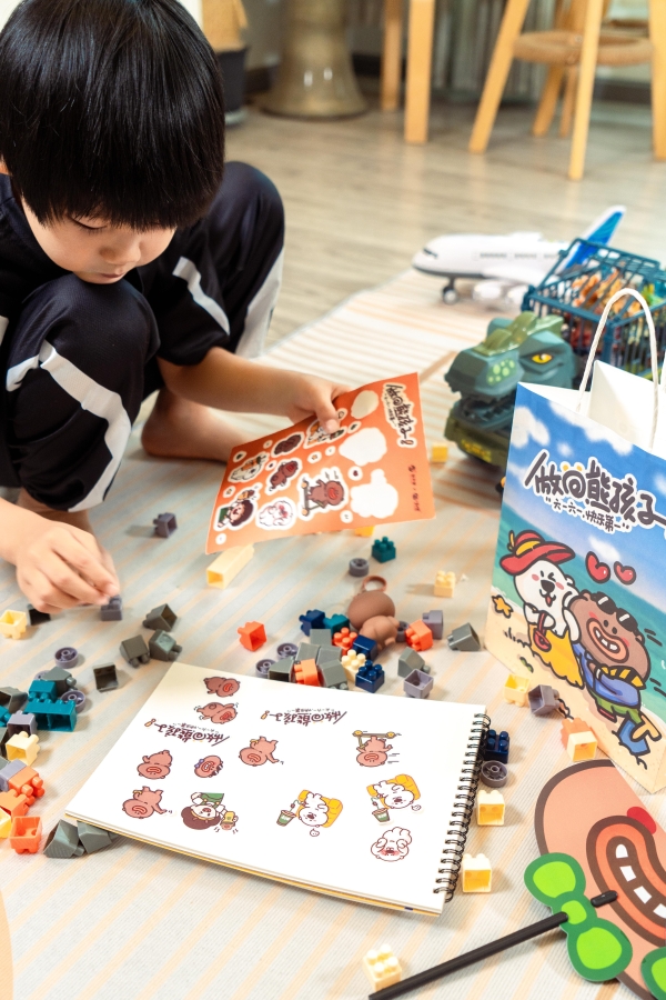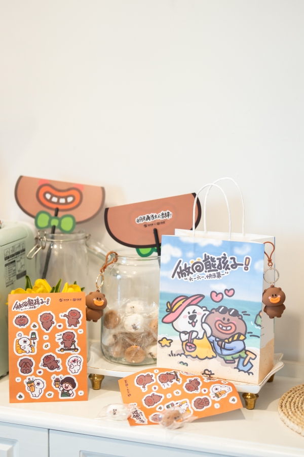 联名物料也充满了“熊孩子”元素,共有5款,分别为联名打包纸袋、联名手摇扇、联名捏捏乐、熊孩子棉花糖、联名贴纸。
