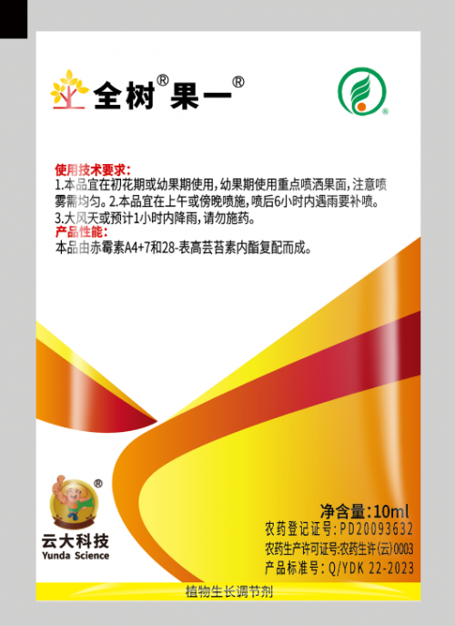 为了应对这一难题,农业科研领域一直在不断探索和研发。在众多产品中,云大科技的全树果一凭借卓越的性能和显著的效果,赢得了广大种植户的青睐。它是一款专为柑橘等果树设计的营养保果剂,全树果一采用先进的生物技术,通过调整植株养分向花和果实转移,促进花蕾发育健壮,降低脱落酸浓度,防止产生分离层,减少花果脱落,提高座果率。