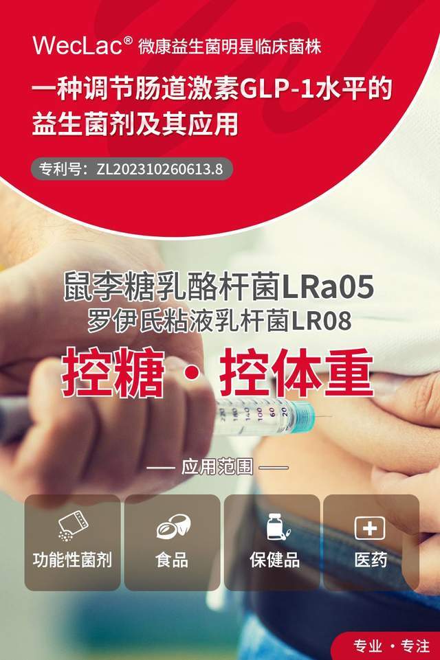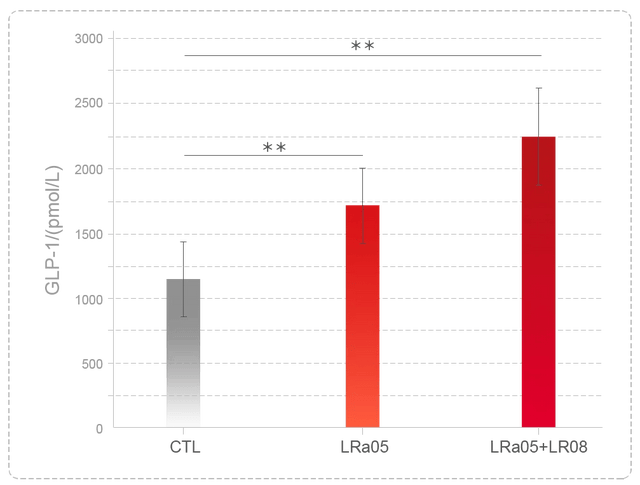 鼠李糖乳酪杆菌LRa05能够显著增强STC-1细胞对GLP-1(胰高血糖素样肽-1)的分泌能力。GLP-1的主要作用之一是刺激胰腺β细胞分泌胰岛素,进而降低血糖水平,还有助于减缓食物中糖分的吸收,控制餐后血糖水平,并通过作用于大脑,增加饱腹感,减少食物的摄入,起到控制体重和改善代谢的作用。