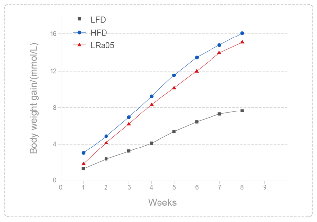 使用LRa05以10亿CFU每天的剂量连续干预8周,通过低脂饮食组(LFD)、高脂饮食组(HFD)和高脂饮食+LRa05干预组(LRa05)的数据对比可以得出结论LRa05可以有效抑制高脂饮食引起的肥胖,显著抑制体重增加。