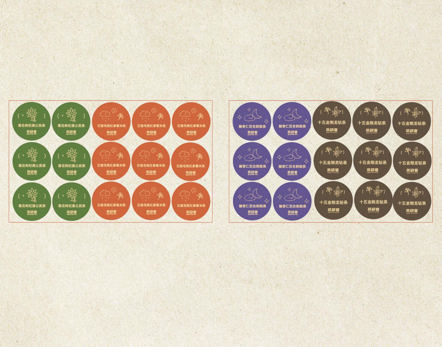内含的四种小罐茶分别为:菊花枸杞蒲公英茶、五指毛桃薏米茶、十五金刚龙钻茶、酸枣仁百合刺梨茶。在色彩运用上,茶研官根据四季色彩节律的变化,分别赋予四种产品春之盎然绿色、夏之赤热橙色、秋之丰收褐色、冬之静谧紫色作为主色调,既符合季节特征,又展现了自然和谐之美。