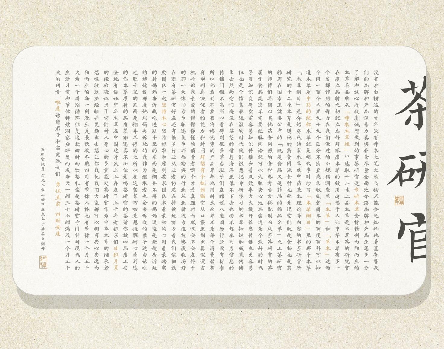 值得一提的是,每一份“四时而饮茶”礼盒中都将附有一封来自茶研官CEO张勇先生的亲笔信。信中,张勇先生分享了自己对茶研官品质的卓越追求和感悟,从信里看得到他的赤诚之心,全文如下: