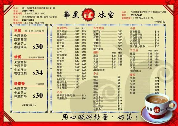 来到香港肯定要尝尝地道的港式茶餐厅,西多士也很出色,面包表面烘烤的刚好,再配一杯地道港式奶茶,简直是香港人下午茶标配!旺角西洋菜南街的「华星冰室」是我的最爱,据说连校长谭咏麟都是这家店的常客,每次来都指定吃一种多士,所以菜单上这道吐司的名称直接命名为了“校长多士”。