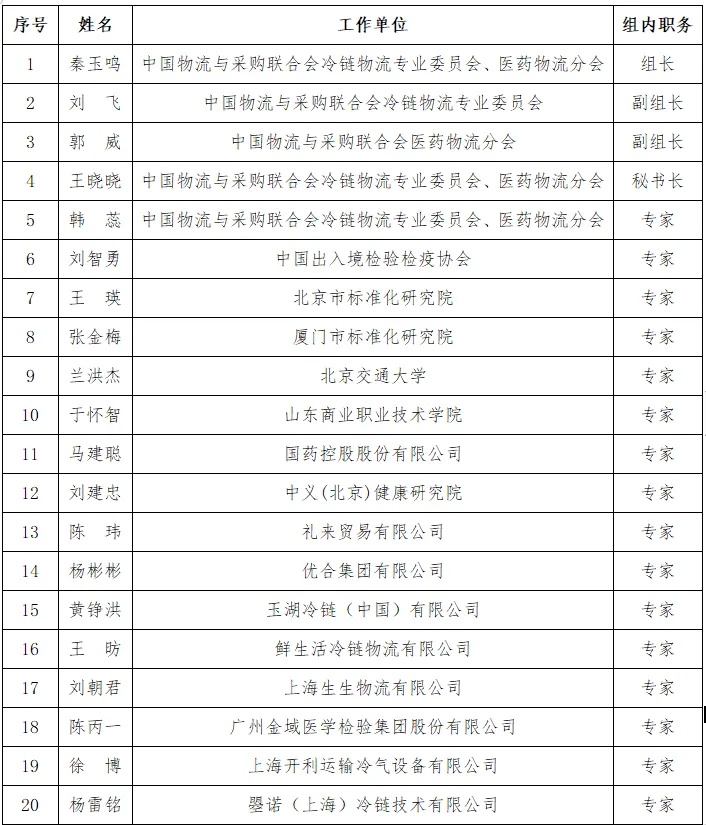 国际标准化组织冷链物流技术委员会(ISO/TC 315)国内技术对口工作组专家名单
