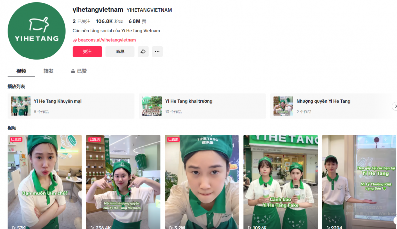 益禾堂越南在TikTok平台上的粉丝已突破10万,成为越南该平台的头部茶饮品牌之一。据公开数据,益禾堂越南在tiktok平台已经发布了多条视频,单条视频最高浏览量近900万次,频道点赞量超过684万次,频道开通一年的观看量达到1.22亿。