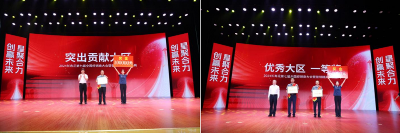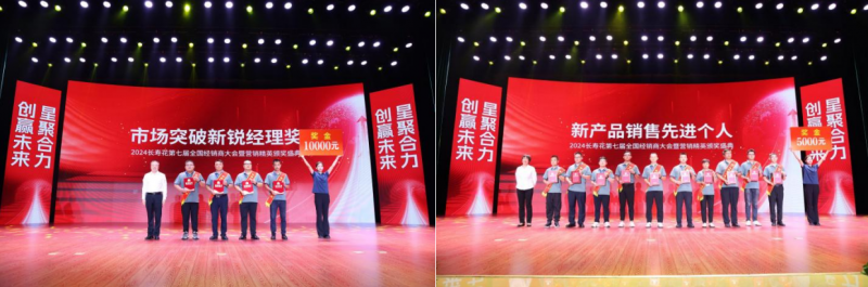热烈盛大的颁奖盛典环节,大会对钻石经销商、金牌经销商,优秀经销商、突出贡献大区、优秀大区及市场突破新锐经理、新产品销售先进个人、优秀办事处主任、优秀业务员、优秀促销员等17个团队、个人奖项进行了表彰奖励。极具分量的重奖,璀璨闪耀的奖杯、美好灿烂的笑容,都定格成一幅幅“创新融合 合作共赢”的珍贵画面。