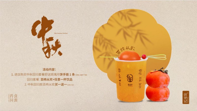 秋风飒飒吹柿黄,满树琳琅映中秋。隐隐于市的茯灵记,于满月之下,携应季回归产品“百柿从欢”,为每一个略显缺憾的瞬间献上顺意从欢的诚挚祝福。作为药食同源养生茶饮,不止中秋,在阴晴圆缺流转之际,茯灵记都会陪伴在都市人身边,期冀在不久的将来,大家都能路遇“桂”人,好“柿”发生。