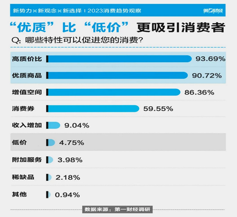 第一财经发布的《2023消费趋势观察》报告显示,在促进消费的各种因素中,93.69%的消费者倾向于高质价比的产品,而追求低价的消费者仅占4.75%。由此可见,高质价比时代,消费者看重的不仅仅是低廉的价格,更是产品的高品质。这种从性价比到质价比的转变,预示着消费市场迈入一个全新的发展阶段。