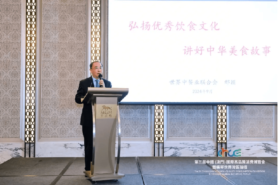 南光(集团)有限公司副总经理宋晓冬,中国企业评价协会执行副会长、北京国评新经济文化交流中心主任、理事长刘晓明,美高梅餐饮部副总裁Geoffrey Simmons,代表主办方致辞。他们强调,澳门作为联合国教科文组织评定的“创意城市美食之都”,承载了四百多年中西美食文化,荟萃了世界佳肴,集聚了一众“老字号”“特色店”“米其林”等餐饮企业品牌。借此高品会期间,来自全国各地的知名餐饮企业、知名酒业等行业知名人士以及本次参展的优质企业相聚澳门,期待大家分享彼此经验和见解,共同助力把澳门国际大都市“金名片”擦得更亮。