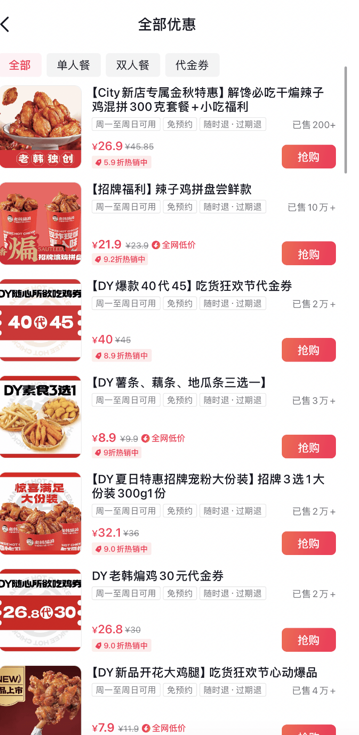 同时,面向多元需求,老韩煸鸡也上架了有针对性的货盘:首次尝鲜,可以购买“麻辣椒香招牌煸鸡+小吃”,立减15.9元,仅需23.9元,低门槛解锁双份体验;复购老粉,可以购买“招牌3选1宠粉大份装”,立享8折,充分过瘾;个性组合、多人聚餐,还可以囤“40抵50”代金券,无限制任选。