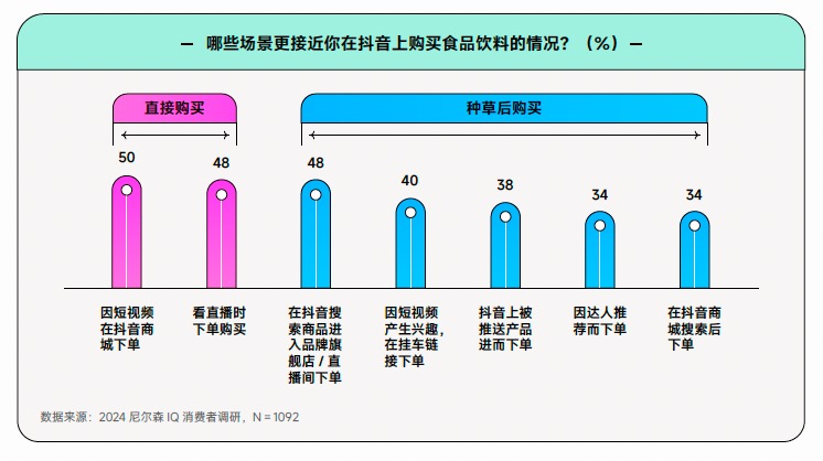 内容电商通过全新的互动展示形式以及购买场景,不仅可以更高效地吸引到消费者关注,其更丰富全面的内容也更易促成消费者购买。数据显示,在抖音商城下购物的受访女性用户占比达63%,男性用户占比也几近于一半,达42%。就食品饮料行业而言,内容电商平台对用户的渗透率也十分明显。不仅仅是只在刷短视频、直播时直接下单购物,今年,有48%的食品饮料消费者是被种草后再次进行搜索而购买,人群渗透率已经赶上立即购买的人数。