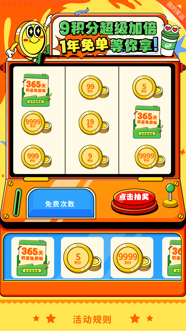 与此同时,益禾堂开启了积分超级加倍活动。用户只需使用9积分,就有机会参与一次积分加倍的机会,最高可获得365天免费喝奶茶的超级大奖!这样的机会怎能错过?即便未能抽中大奖,也会获得至少5积分的奖励。每人每天最多可参与3次!