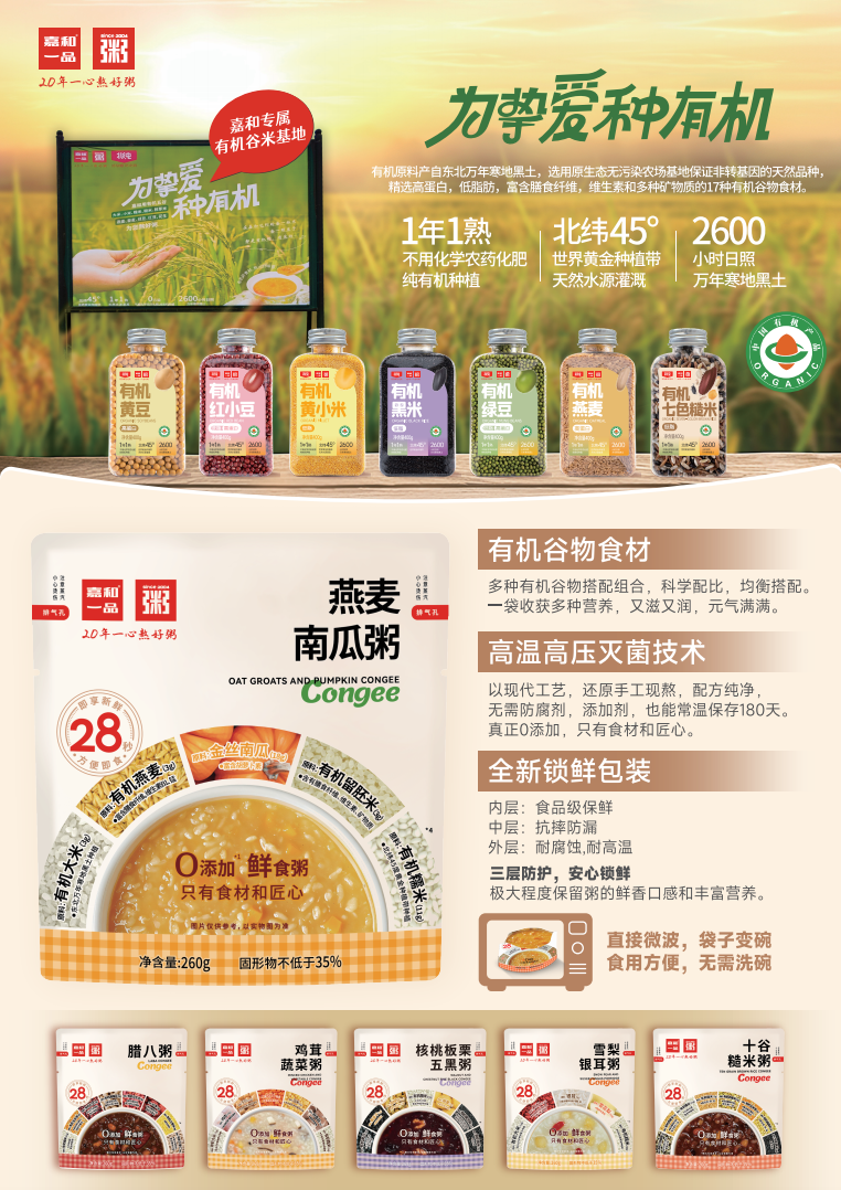 而嘉和推出的“元气粥”,将有机谷米熬制的鲜粥用锁鲜技术入袋,袋子还可以变形当做碗来使用,满足不同场景的消费需求,进一步增加了门店的复购频次,也为嘉和一品在激烈的市场竞争中赢得了稳固的立足之地。元气粥完美解决了现代人快节奏生活中无暇煮粥的困扰,无论是忙碌的早晨,还是加班后的夜晚,只需简单操作,就能立刻享受到一碗热气腾腾、美味可口、健康安全的粥。出门旅行时带上几包,在酒店也能轻松喝到熟悉的家乡味道,充分满足了每个消费人群更多场景的消费需求。