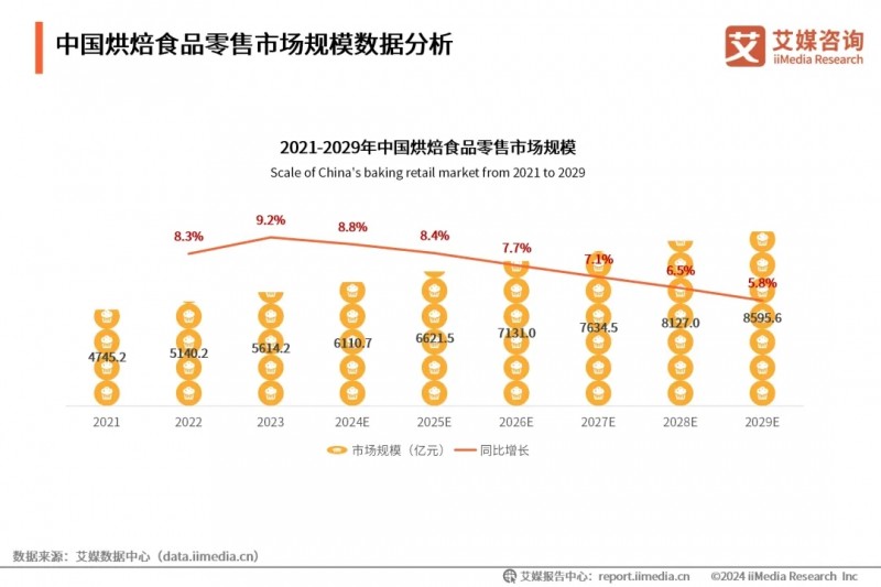 近年来,中国烘焙食品市场呈现出蓬勃发展的态势。据艾媒数据统计,2023年中国烘焙食品零售市场规模已达到5614.2亿元,同比增长9.2%,预计2029年将有望突破8000亿元大关。这一迅猛的增长不仅反映了消费者生活水平的提高和消费习惯的变化,也体现了烘焙食品从传统的餐桌配角逐渐转变为日常零食、送礼佳品等多元化消费场景的趋势,这为具有创新能力和市场敏感度的企业提供了新的发展机遇。