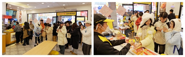 门店外大排长龙,纵使店外寒风萧瑟,也挡不住免费吃汉堡的火辣热情。