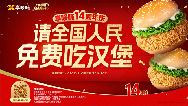 近日,享哆味14周年庆活动突然成为网络热点,热度持续上升。事件起因要从“享哆味14周年庆,请全国人民免费吃汉堡”说起。12月2日开始,享哆味小程序开放免费领券,凡是领到券的粉丝,可在12月14日至16日期间,免费吃汉堡!