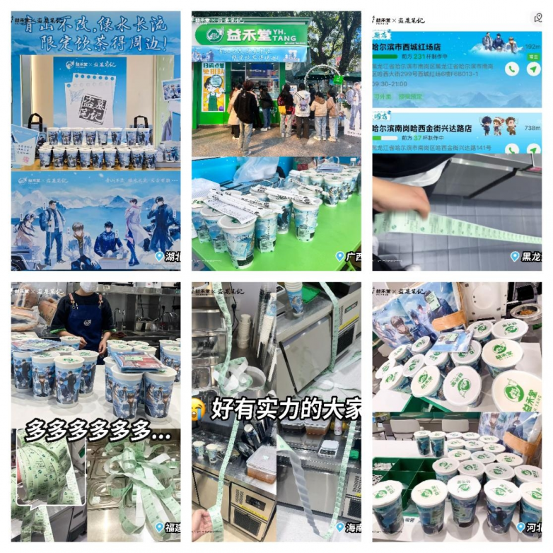 除此之外,益禾堂还联动十大城市户外大屏预热活动;在全国多地设立线下联名主题店,从店内布局到细节装饰都力求还原书中的神秘氛围;在河南洛阳、广西南宁打造主题快闪活动……不仅充分凸显联名元素,更深挖细节,连接起书中世界与现实,吸引了大量粉丝和消费者前来打卡互动,现场气氛热烈,大家欣喜地表示此次联名活动让人深度感受到那份跨越时空的情感共鸣,体验了前所未有的惊喜和欢乐。