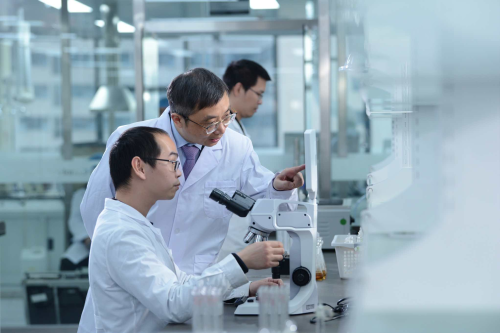 仙芝楼董事长李晔(中)在仙芝楼科研中心与科研人员交流指导