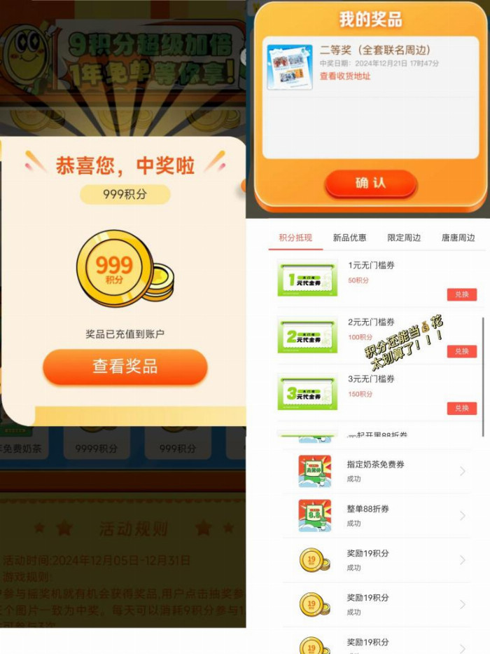 益禾堂积分狂欢月活动自12月5日开始截至12月29日,积分使用人数已超百万人,其中使用积分数峰值高达2000万,日均超500万,在各个社媒平台都收获了大家的积极反馈,也有很多“幸运儿”在各个平台分享自己的中奖喜悦,为品牌带来了良好的口碑传播效应。从用户分享的内容可以看到:大额积分、免费奶茶、定制周边纪念品等奖品频频现身,充分证明了活动的真实性和吸引力。
