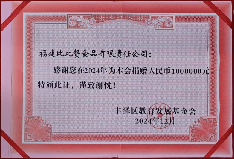 2024年12月,比比赞向丰泽区教育发展基金会捐赠100万,用于支持教育事业、扶危济困助学。据了解,丰泽区教育发展基金会始建于2017年,是泉州市第一家区(县、市)级教育基金会,所筹得的善款均用于奖优济困、助学奖教。作为起步于福建泉州的休闲零食企业,比比赞情系家乡教育公益发展,以百万善款为家乡学子的“成才梦”添砖加瓦、助力家乡学校基础设施建设,进一步促进了教育的公平性和均衡发展。