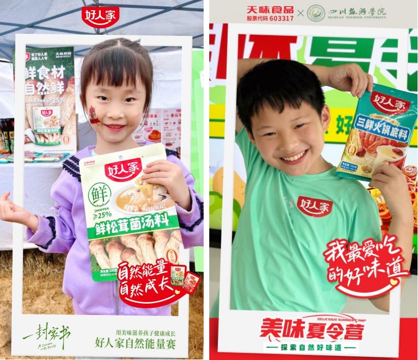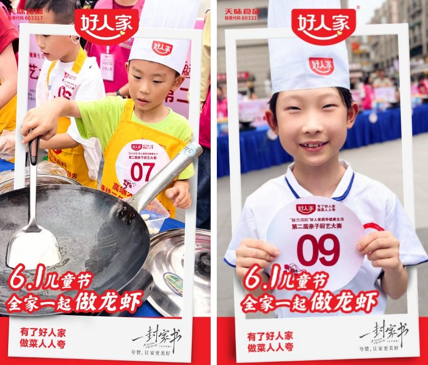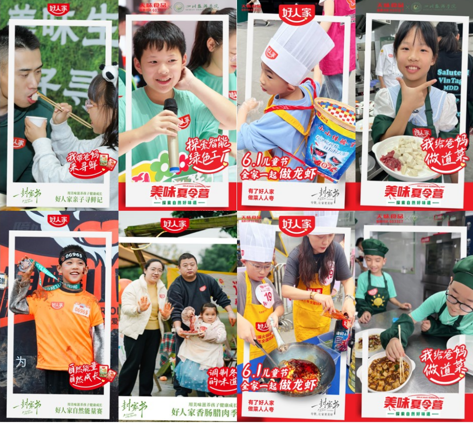 好人家“一封家书”栏目自开办以来一直举办多样化的亲子活动,鼓励孩子们制作各色菜品收获新体验。去年五四青年节期间,好人家与四川旅游学院合作,成立了“好人家夏令营探索小队”,来自全国各地的小朋友一同走进天味食品工厂,探索好人家守护自然风味的秘密,在老师、家长和好人家产品的助力下,孩子们抡起大勺为父母下厨,制作了麻婆豆腐、鲜番茄鸡蛋汤等美味佳肴,好人家特别为孩子们颁发“美味奖牌”,让孩子们感受烹饪的乐趣。